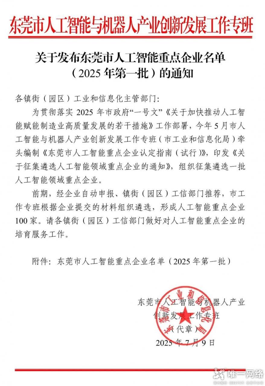 近日,東莞市人工智能與機器人產(chǎn)業(yè)創(chuàng)新發(fā)展工作專班正式發(fā)布《東莞市人工智能重點企業(yè)名單(2025 年第一批)》,唯一網(wǎng)絡憑借在人工智能領域的戰(zhàn)略布局、技術積淀與產(chǎn)